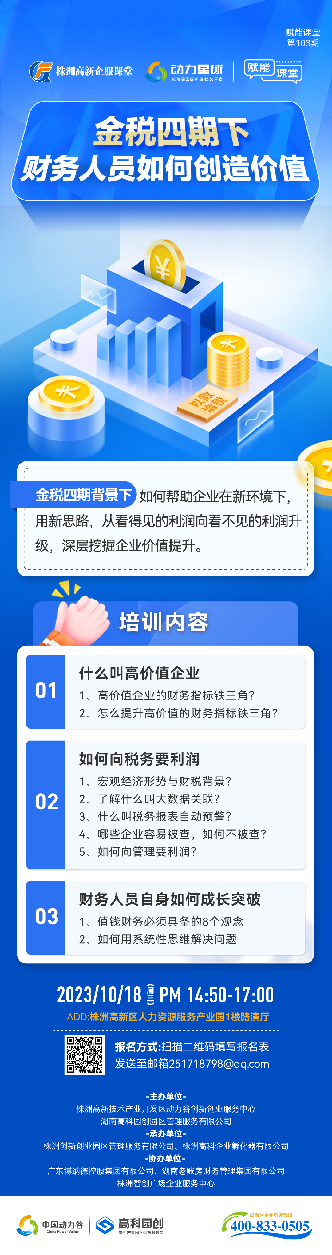 为帮助财务人员不断提升专业水平,及时把握政策变革的前沿动向,从前端经营业务开始进行涉税风险把控,突破固有思维,降低企业涉税风险,推动企业健康稳定发展。株洲高新区动力谷双创中心、湖南高科园创特拟定于2023年10月18日(星期三)开展“金税四期下-财务人员如何创造价值”主题培训,有意向的企业均可报名参加。活动具体事项详见宣传海报。