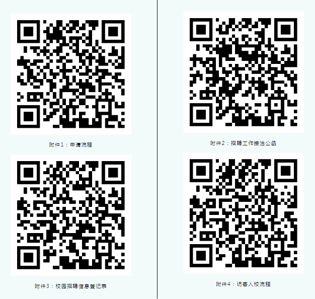 08. 附件: 请扫描二维码查看申请流程、招聘工作接洽公函、校园招聘信息登记表及来访客入校流程: