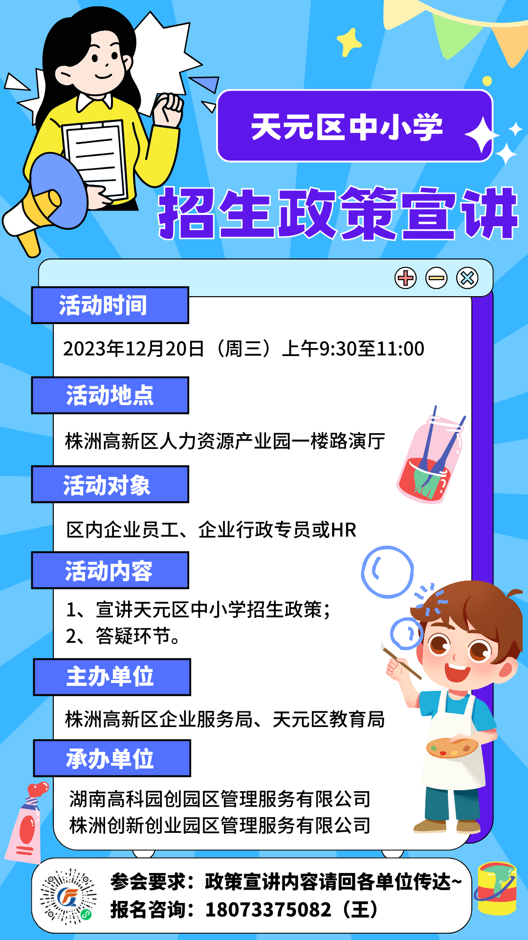 为方便有子女入学需求的新区企业员工深入了解招生政策,确保企业员工子女可按政策顺利报名入学,高新区企业服务局联合天元区教育局拟开展主动服务企业活动——面向新区企业开展天元区中小学招生政策宣讲活动。 上一篇:“金税四期下—财务人员如何创造价值“ 主题培训活动 下一篇:【株洲高新企服课堂】菁企汇|株洲高新区、天元区“企业资本市场菁英”培养工程结业仪式暨专场路演活动